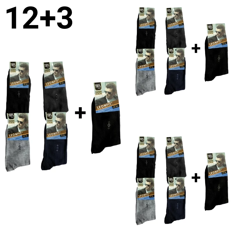 Veľké balenie pánskych ponožiek obsahujúce 12 párov + 3 páry zdarma. Praktické riešenie na každodenné nosenie, ktoré zaručuje odolnosť a pohodlie.