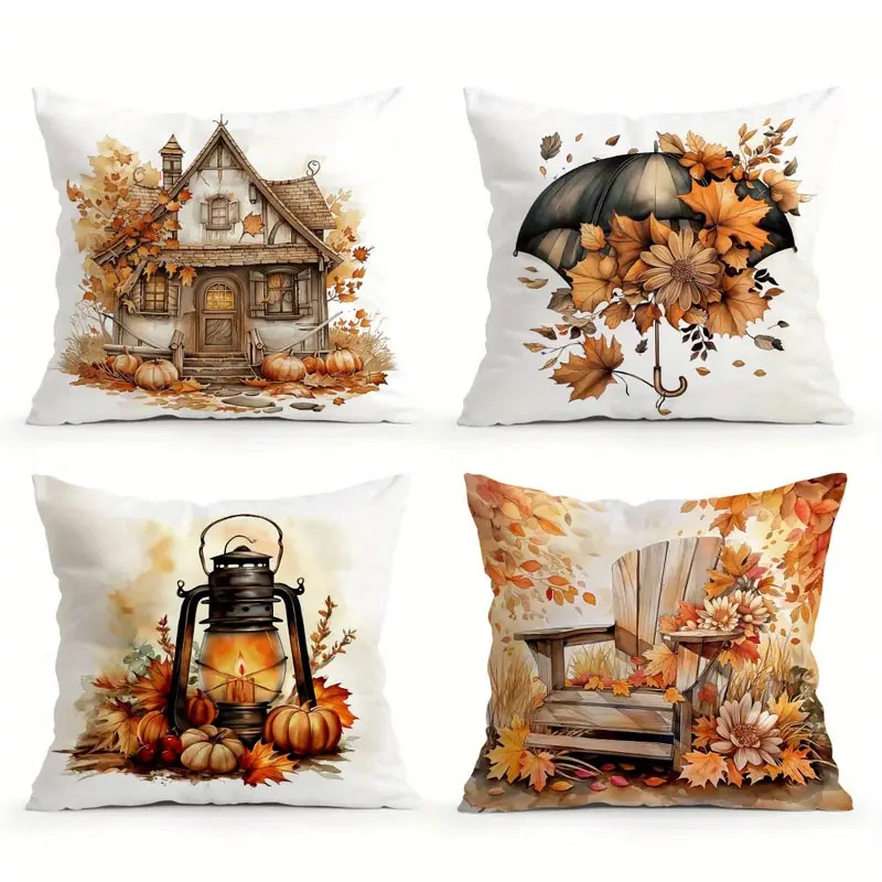 Táto 4-dielna sada jesenných obliečok na vankúše prinesie do vášho domova hrejivú a priateľskú atmosféru. Rôzne vzory – domček s tekvicami, dáždnik s jesennými listami, vintage lampáš a veranda so stoličkou – pôsobia ako jedinečná sezónna dekorácia, ktorá oživí obývačku, spálňu či terasu.