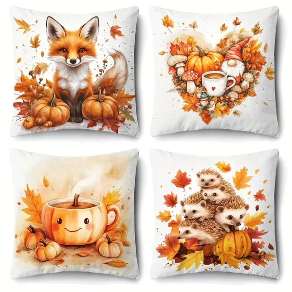 Vneste do svojho domova jesennú atmosféru s touto pôvabnou 4-dielnou sadou obliečok na vankúše, ktorá je ideálnou voľbou do obývačky, spálne alebo aj na terasu. Rustikálne, farmárske vzory s veselou líškou, rodinkou ježkov, tekvicami a sezónnymi motívmi dodajú každému priestoru útulný charakter.