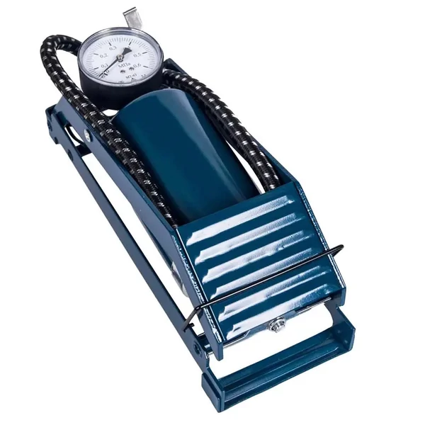 Robustná, spoľahlivá nožná pumpa, ktorá je ideálna na nafukovanie pneumatík áut, motocyklov a bicyklov. Kovové telo zaisťuje odolnosť a dlhú životnosť, zatiaľ čo vstavaný tlakomer umožňuje presné ovládanie. Hadica s dĺžkou 60 cm a stabilná, robustná kovová spojovacia hlava zaručujú jednoduché a bezpečné používanie. Vďaka manuálnej nožnej aretácii je možné pumpu pohodlne zaistiť a je ľahko ovládateľná.