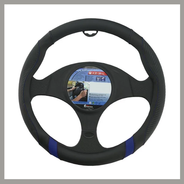 Štýlový a funkčný poťah určený pre volanty s priemerom 37–39 cm, ideálny pre športové automobilové modely. Kombinácia čiernej farby s modrým šitím a karbonovým efektom po stranách dodáva interiéru dynamický vzhľad.