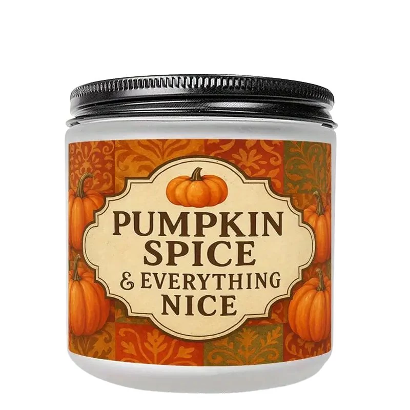 Dizajn: sezónna etiketa s nápisom „Pumpkin Spice & Everything Nice“