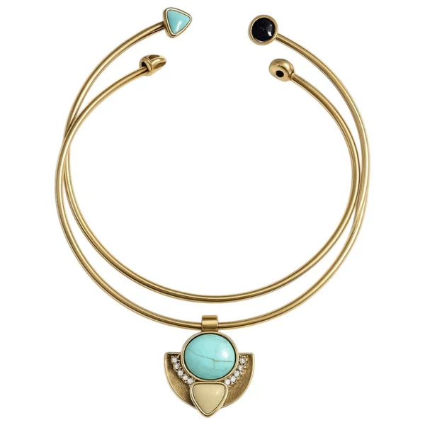 Tento jedinečný, dvojradový náhrdelník v zlatej farbe elegantne kombinuje tyrkysové a krémové ozdobné kamene, spájajúc moderný a klasický štýl. Je perfektnou voľbou na špeciálne príležitosti, no jednoducho ho zladíš aj s každodenným outfitom.