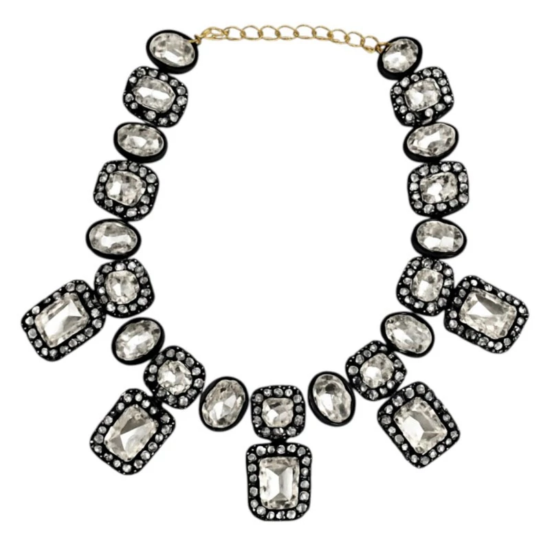 Tento výnimočný, výrazný náhrdelník je perfektným doplnkom na elegantné podujatia, no dokáže oživiť aj bežné outfity. Veľké trblietavé kryštály a čierny základ mu dodávajú moderný, no zároveň elegantný vzhľad.