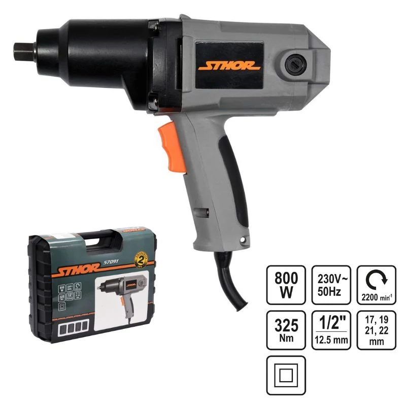 Výkonný elektrický rázový kľúč, ktorý uľahčuje rýchle uvoľňovanie alebo utiahnutie skrutiek kolies a iných ťažko rozbitných spojov. Motor s výkonom 800 W a krútiacim momentom 325 Nm umožňuje odstrániť matice kolies za niekoľko sekúnd. Ideálny pre domáce použitie, dielne alebo núdzové situácie na ceste.