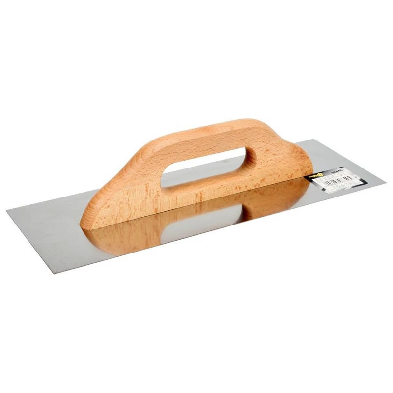 Hladidlo z nerezovej ocele s hladkým povrchom, ideálne na vyrovnávanie omietok, mált a iných povrchov počas stavebných a renovačných prác.