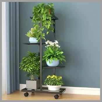 Vnútorný/vonkajší kovový kvetinový stojan na kolieskach – 4 úrovne, čierny AF122560