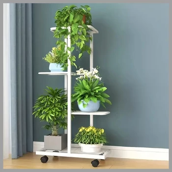 Vnútorný/vonkajší kovový kvetinový stojan na kolieskach – 4 úrovne, biely AF122560-b