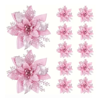 Vianočná sada kvetinových dekorácií s trblietkami – 15 kusov, ružová, 14 cm – VT4955153-5