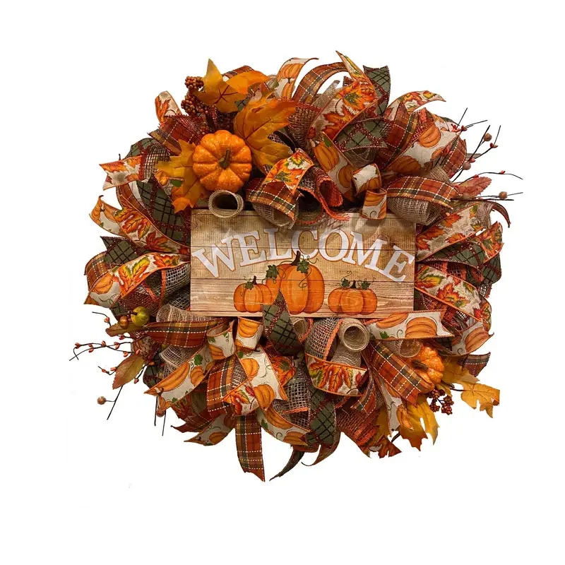 Vytvor vo svojom domove priateľskú a sviatočnú atmosféru s týmto elegantným, glam štýlovým jesenným vencovým aranžmánom! Veniec je zdobený stuhami s tekvicovým vzorom, textilnými listami, drobnými tekvičkami a detailmi v sezónnych farbách. V strede sa nachádza tabuľka s nápisom „WELCOME“ v drevenom vzhľade, ktorá predstavuje dokonalú uvítaciu dekoráciu pre tvojich hostí.