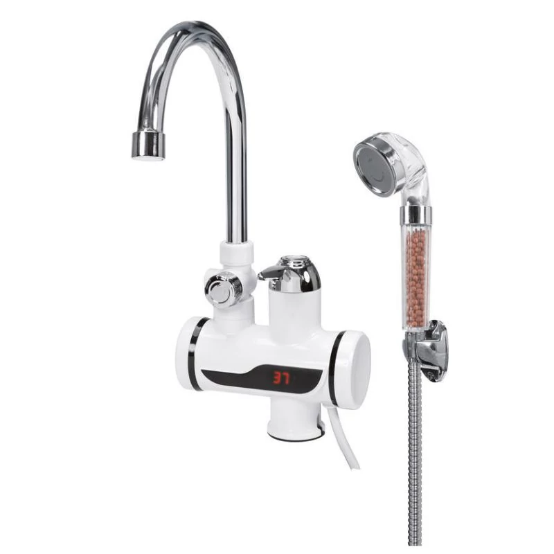 Stojaca batéria (na podlahu alebo na stenu) so zabudovaným prietokovým ohrievačom vody a ručným sprchovým setom.