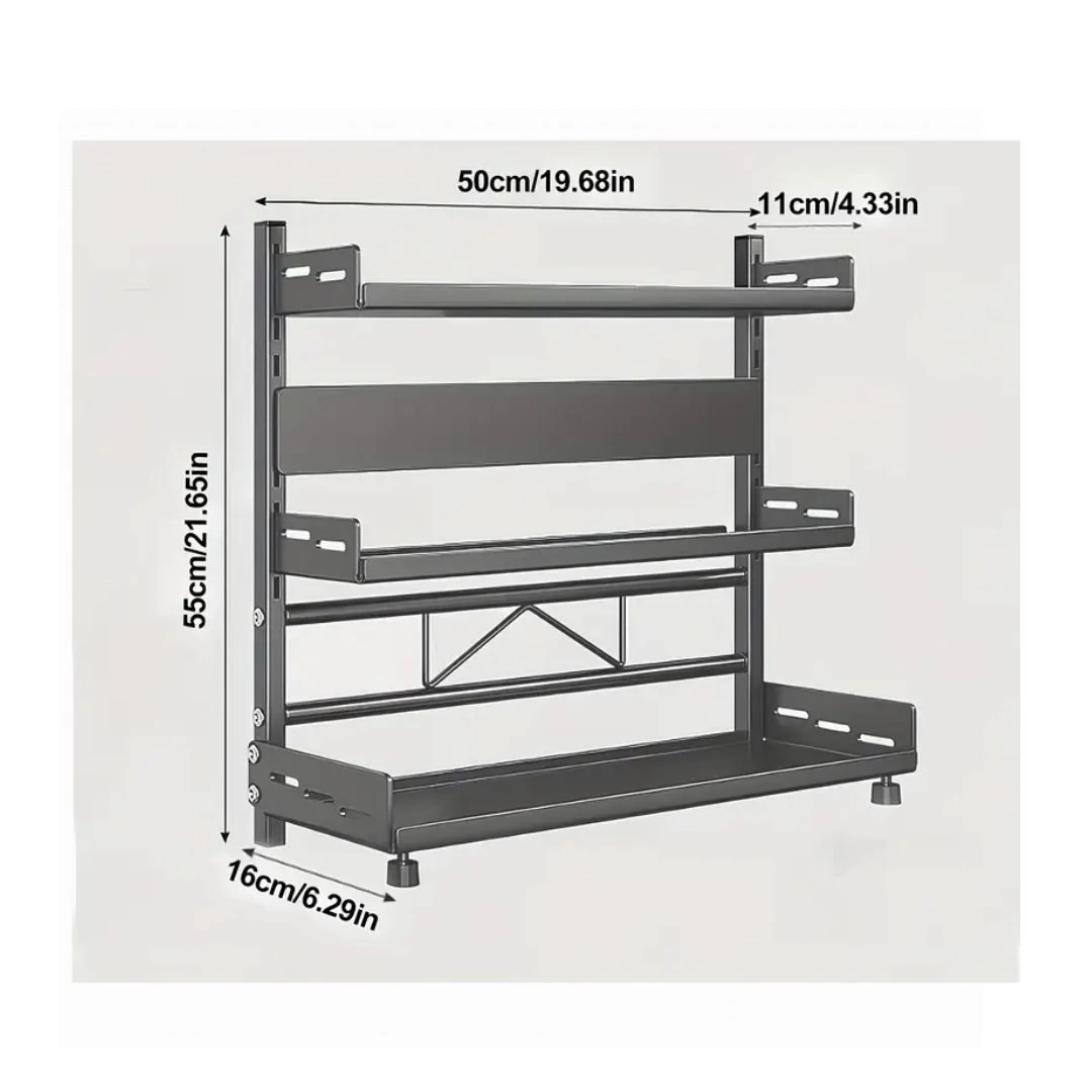 Táto robustná kovová odkladacia polica je praktickým a priestorovo úsporným riešením pre vašu kuchyňu, komoru alebo dokonca kúpeľňu. Jej trojstupňová konštrukcia poskytuje dostatok priestoru na koreniny, riad, príslušenstvo alebo čistiace prostriedky.