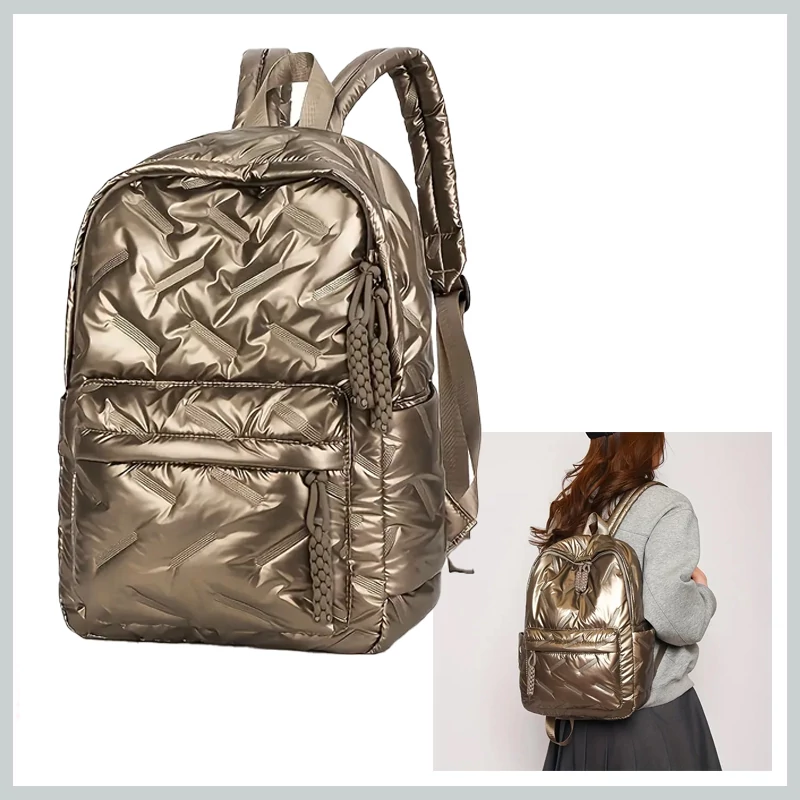 Moderný a výrazný batoh v lesklom zlatom prevedení s prešívaným dizajnom. Štýlový doplnok na každodenné nosenie, ktorý zaujme na prvý pohľad. Vhodný do mesta, na voľný čas, nákupy alebo ako módny ruksak na výlety.