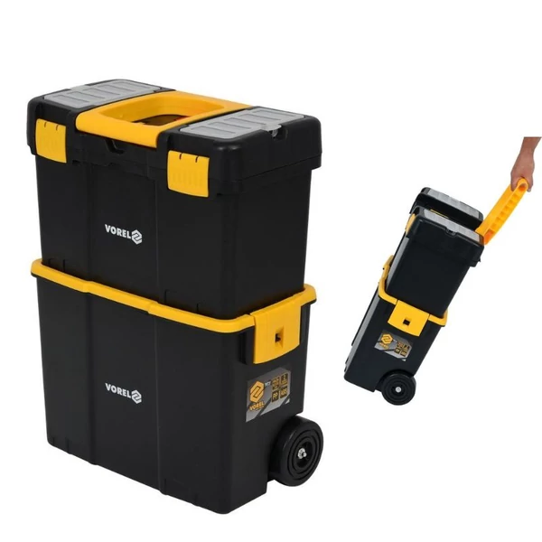 Kompaktný, ľahko prenosný, dvojdielny vozík na náradie s praktickým odnímateľným horným organizérom. Vyrobený z odolného plastu odolného proti nárazom, so spoľahlivými sponami proti neúmyselnému otvoreniu — ideálny pre domáce a hobby dielne, údržbu a menšie montáže.