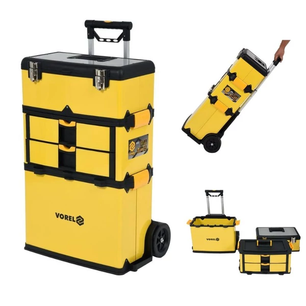 Trojdielny, mobilný vozík na náradie pre usporiadané uloženie malých nástrojov a doplnkov. Masívne ABS prevedenie, odolné proti poškriabaniu a nárazom, oceľová pracovná doska na vrchu — ideálne do dielní, garáží a údržbárskych priestorov.