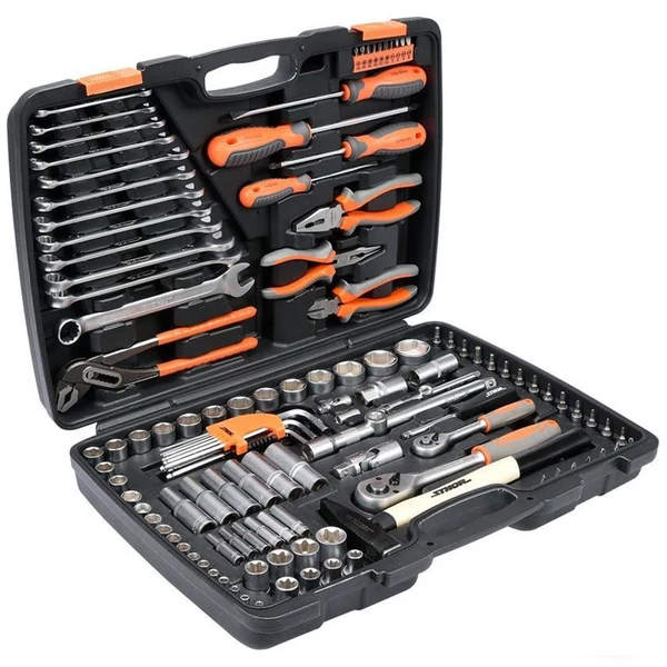 Praktické prenosné puzdro obsahujúce sadu vysoko kvalitných nástrčných kľúčov z nástrojovej ocele. Balenie obsahuje dve račňové kľúče, množstvo bitov, adaptéry, nástrčné kľúče a ručné náradie, všetko prehľadne usporiadané. Plynulú prevádzku zabezpečuje 45-zubový račňový mechanizmus. Kľúče sú vyrobené pomocou systému As-Drive: vnútorný profil je mierne zakrivený, takže zaťaženie je rozložené po celej ploche. Tým sa znižuje opotrebenie skrutiek a uľahčuje sa uvoľňovanie poškodených skrutiek. Sada je univerzálna a dá sa použiť doma, v garáži a dokonca aj na cestách.