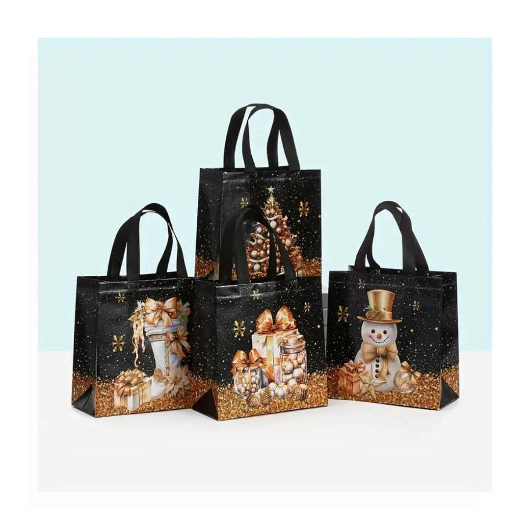 Elegantná a praktická sada darčekových tašiek v zlatej a čiernej farbe so sviatočnými vzormi. 12-dielna sada je ideálnou voľbou na štýlové balenie vianočných darčekov.