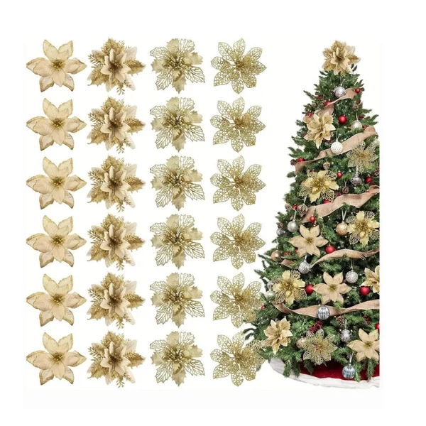 Sada vianočných kvetinových ozdôb – 24 kusov, zlatá, 14–15 cm – NV167367-2