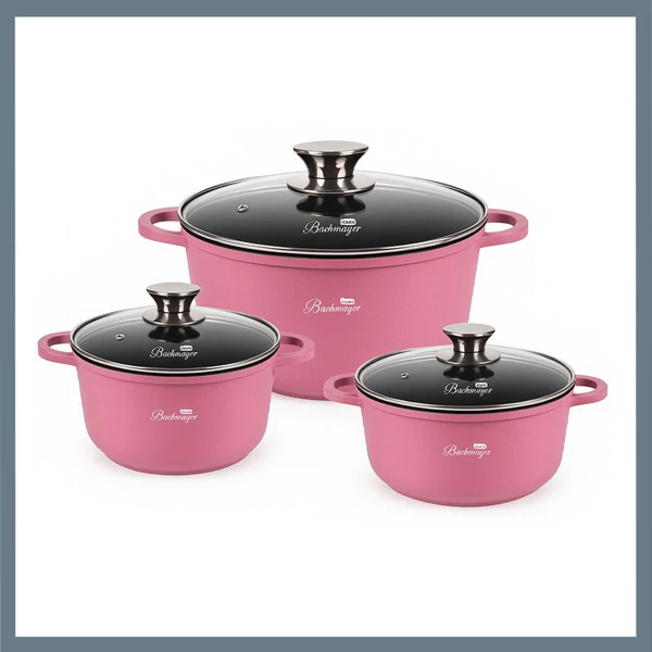 Štýlová a moderná 6-dielna súprava hrncov Bachmayer BM-7870 v ružovej farbe prinesie do každej kuchyne nádych elegancie a sviežosti. Ideálna na každodenné varenie s dôrazom na dizajn a praktickosť.