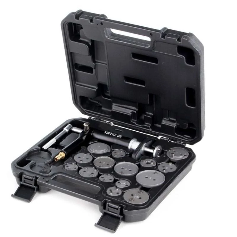 Táto súprava na montáž brzdových strmeňov a brzdových doštičiek s tlakovým vzduchom ponúka profesionálne riešenie pre rýchlu a presnú montáž kotúčových bŕzd. Umožňuje ľahké zatlačenie brzdových piestov, čo z neho robí ideálny nástroj pre servisné strediská a dielne.
