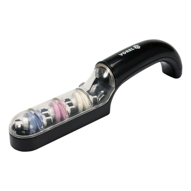 Brúska na nože s tromi rôznymi dvojitými kotúčmi s odlišnou tvrdosťou, navrhnutá na efektívne brúsenie nožov a podobných nástrojov.