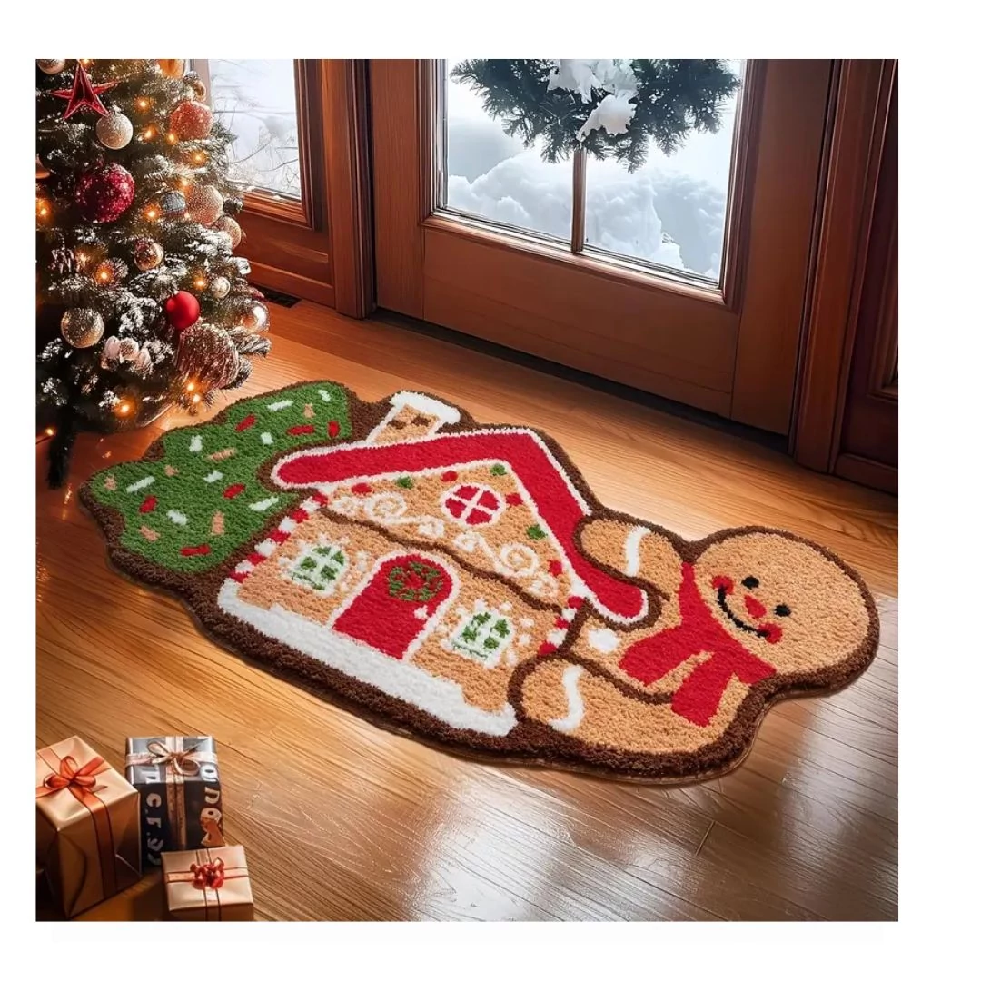 Veselý a útulný vianočný koberček zdobený perníkovými domčekmi, vianočnými stromčekmi a usmievavými perníkovými postavičkami. Farebný, detailný vzor vytvára sviatočnú atmosféru, pričom koberec je mäkký a príjemný na dotyk.