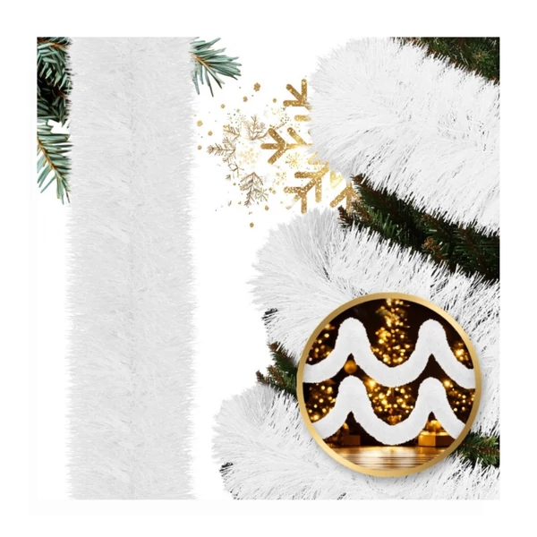 6 metrov dlhá a 13 cm široká biela vianočná girlanda dodá vášmu domovu elegantný, zasnežený vzhľad. Je ideálna na vianočné stromčeky, zábradlia, dekorácie dverí alebo okien a dá sa použiť na mnoho spôsobov ako slávnostná dekorácia. Husté, mäkké vlákna vytvárajú slávnostnú atmosféru a odolný materiál umožňuje jej použitie rok čo rok.