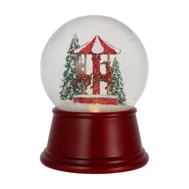 Vo vnútri gule sa nachádza detailná pohyblivá vianočná kolotoč, osvetlená LED svetlami, pričom jemná hudba a víriace vločky oživia sviatočné kúzlo.