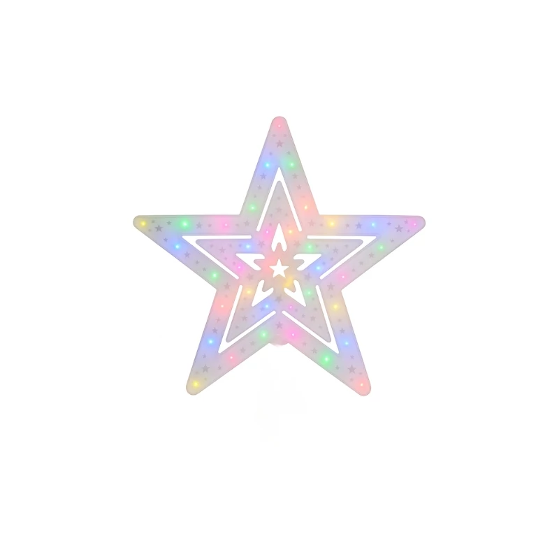 Útulná LED vianočná dekorácia. Farebné LED svetlá svietia vo vnútri bielej dosky s hviezdicovým vzorom a vytvárajú tak príjemnú a slávnostnú atmosféru vo vašej domácnosti alebo ako dekorácia výkladu. Produkt sa dá ľahko umiestniť na poličku, parapet alebo komodu a vďaka svojej energetickej úspornosti ho môžete používať po celý sviatočný čas.