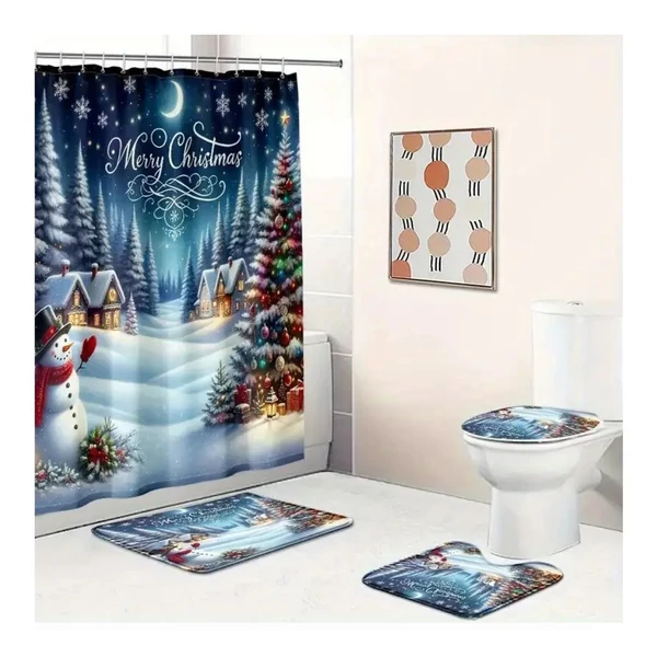 Sviatočná vianočná kúpeľňová sada zdobená snehuliakmi a motívmi zimnej krajiny. Súprava obsahuje veľký sprchový záves, kryt na záchodové sedadlo a dva koberčeky, ktoré poskytujú kompletnú výzdobu vašej kúpeľne.