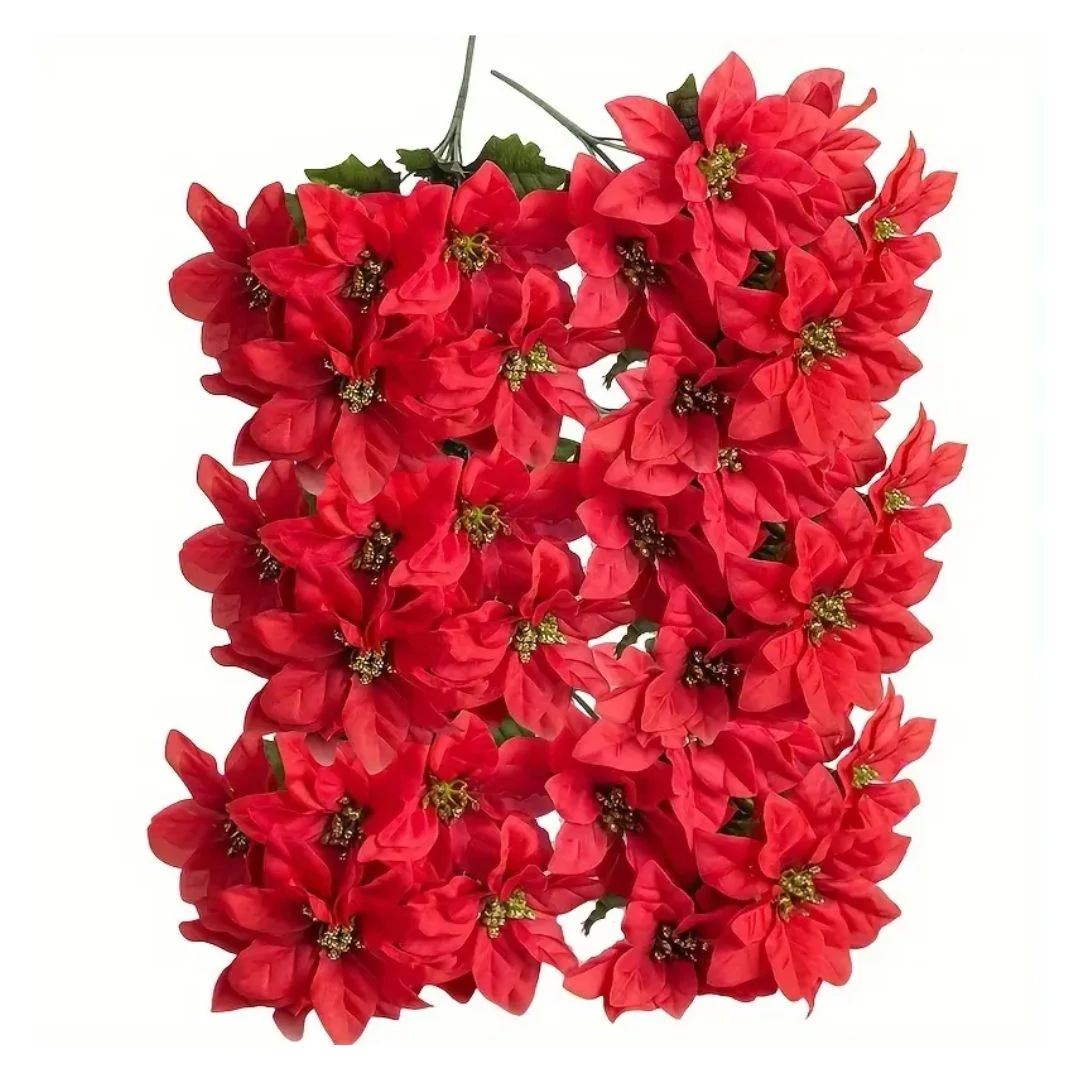 Dekoratívna umelá kytica z vianočných hviezd, ktorá je perfektným doplnkom vašich vianočných dekorácií. Červené okvetné lístky a zelené listy vytvárajú slávnostnú atmosféru a kytica je vhodná ako dekorácia na stôl, do vázy alebo aj ako súčasť venca.