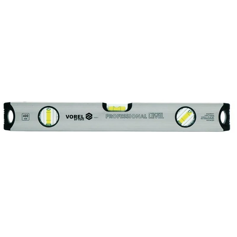 Vodováha vyrobená z eloxovaného hliníkového profilu, s tromi libelami na meranie zvislých, vodorovných a 45° uhlov.