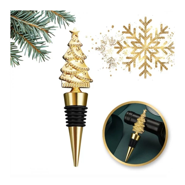 Exkluzívna zátka na fľašu vína so zlatou vianočnou ozdobou v tvare stromčeka, štýlový a slávnostný doplnok k vášmu stolu. Kovové telo vyžaruje eleganciu, zatiaľ čo silikónové tesnenie zaručuje zachovanie arómy a sviežosti vína. Perfektná voľba na vianočné večere, slávnostné oslavy alebo ako darček.