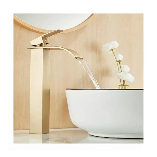 Táto elegantná zlatá zvýšená batéria dodá vašej kúpeľni moderný a luxusný vzhľad. Čistý, hranatý dizajn a vodopádová výtoková trubica sú štýlovým a praktickým riešením pre umývadlá.